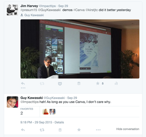 *My friend and much admired presentation expert Kirsty Hollis from the fab team at Sydney Australia based Presentation Studio – ‘We breathe life into your presentations’, did a much better job of evangelizing Canva the day before in her presentation break-out session. I rather cruelly tweeted this opinion after mr K’s presentation, and he, charming as ever, answered thus…